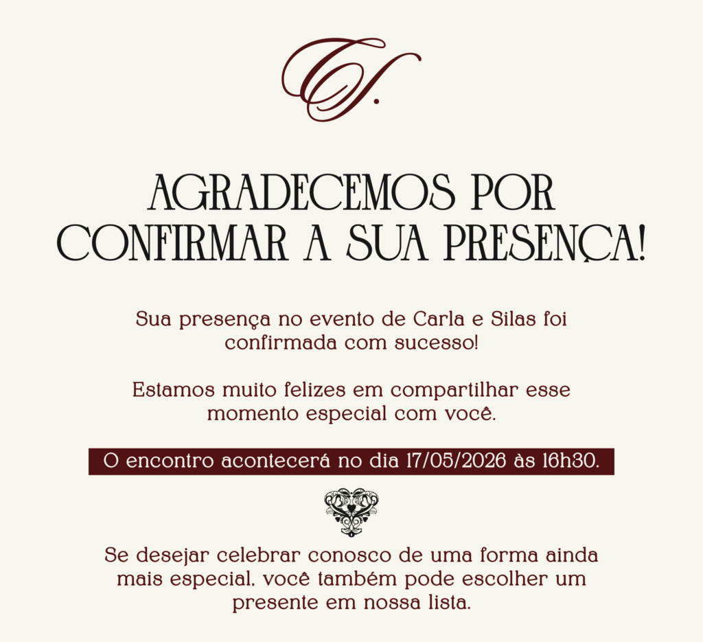 A celebração do nosso matrimônio só será completa com a alegria da sua companhia. Para que possamos preparar cada detalhe com o carinho que este momento exige. solicitamos a gentileza de confirmar sua presença